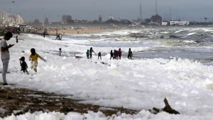 The phenomenon, which locals initially mistook for sea froth, is actually the result of chemical and sewage contamination entering the waters through the Adyar River.