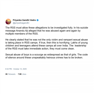 Priyanka Gandhi took to the social media platform X to demand accountability, saying, “The RSS must allow these allegations to be investigated fully. In his suicide message, Anandu Aji alleged that he was abused again and again by multiple members of the RSS.”